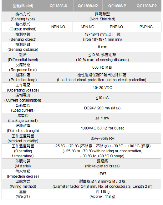 輸出模式:NPN.NO/NC和PNP.NO/NC