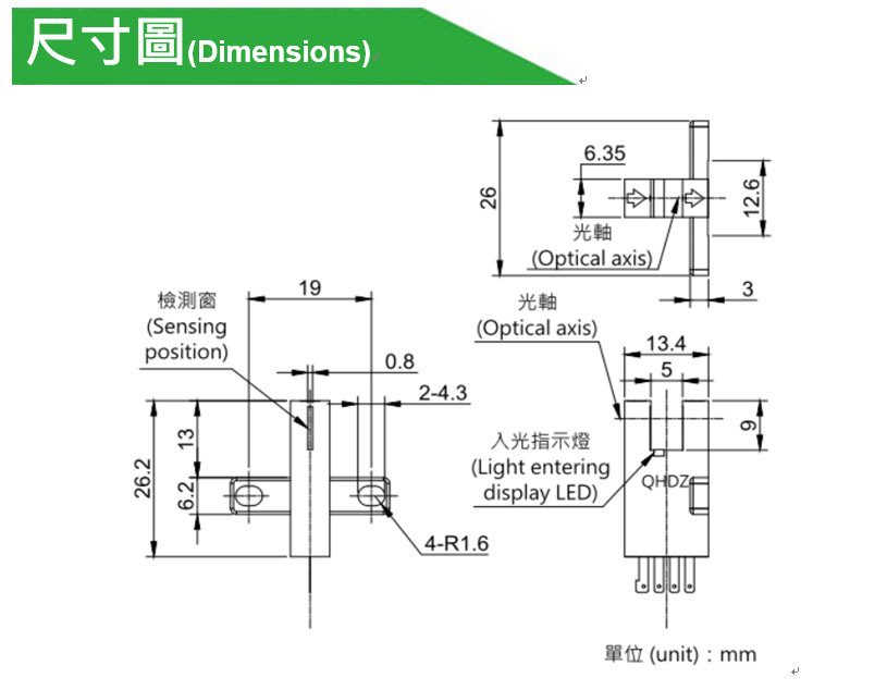 所謂光電素子,主要是指作為客戶機器內建用途的小型放大器內建光電感測器。與一般的放大器內建的光電感測器相同,用於檢測通過物體和定位,但檢測物體多半是稱之為「擋塊」的金屬片。擋塊若進入光電素子的檢測範圍,光電素子將以光學檢測,發出輸出訊號。