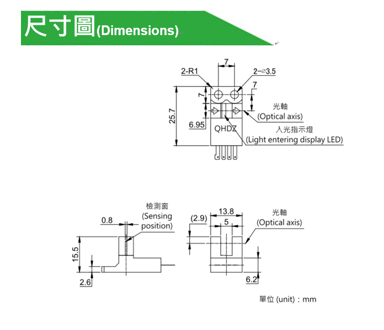 所謂光電素子,主要是指作為客戶機器內建用途的小型放大器內建光電感測器。與一般的放大器內建的光電感測器相同,用於檢測通過物體和定位,但檢測物體多半是稱之為「擋塊」的金屬片。擋塊若進入光電素子的檢測範圍,光電素子將以光學檢測,發出輸出訊號。