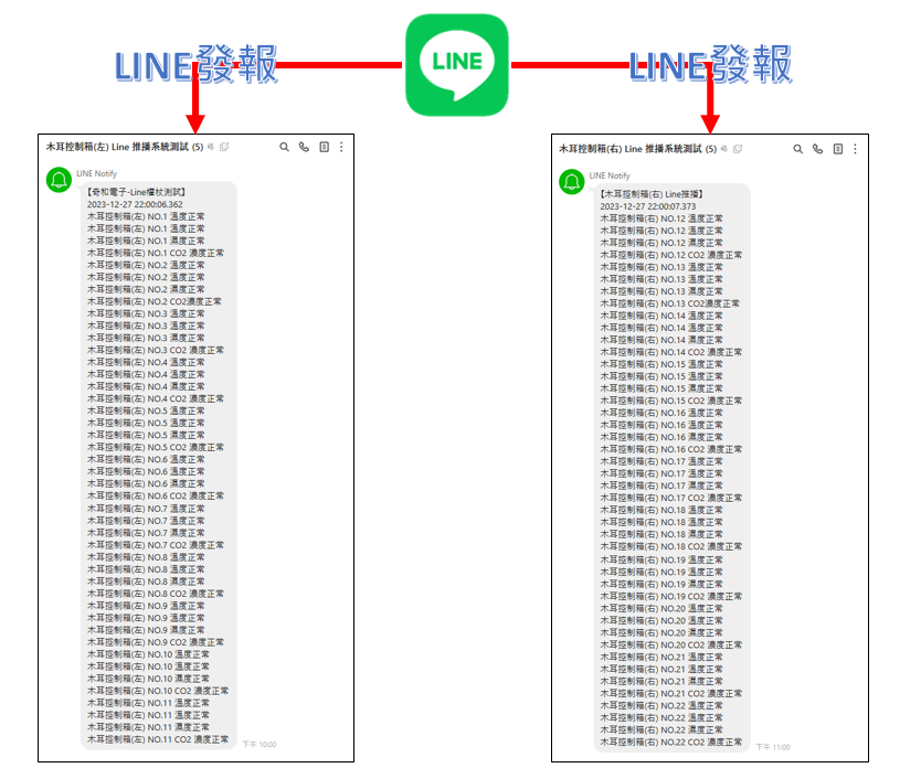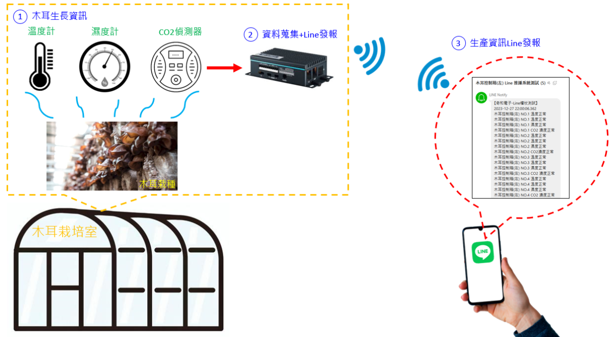木耳在養殖過程中,溫溼度與CO2的控管會直接影響木耳採收的產量,因此為了可以迅速的掌握木耳生產過程中的環境資訊,系統會在整點的時候,以Line的方式彙整木耳溫室中的溫溼度與CO2 資訊,並傳送到我們的手持式裝置上,藉此管理者就無須時刻緊盯現場,大幅減輕工作負擔,提高生產管理的成效。