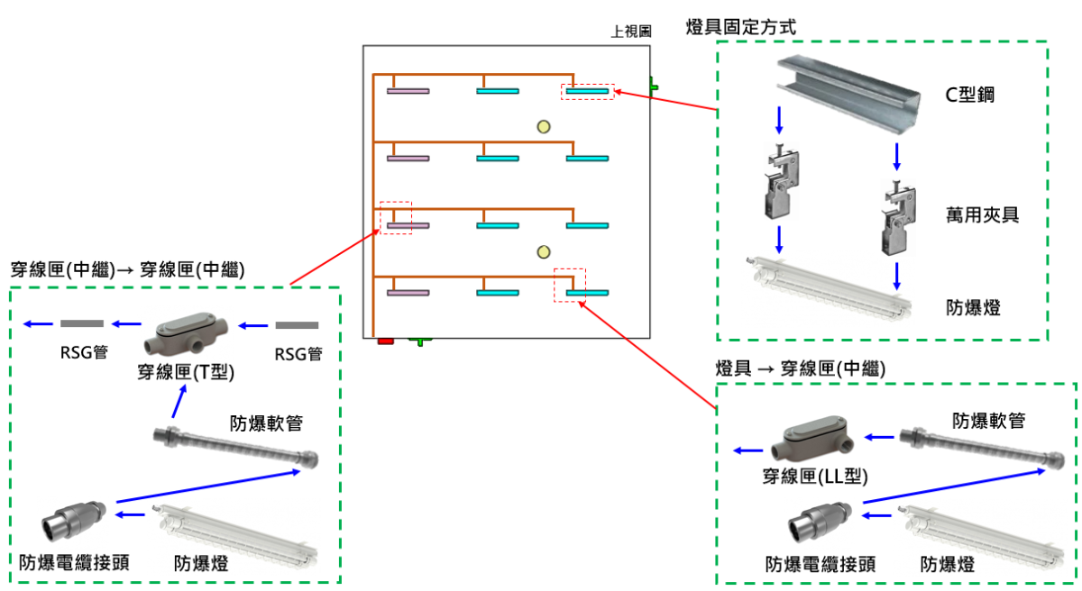 1. 防爆施工過程皆符合防爆安裝法規 CNS 3376-14/IEC 60079-14 。
