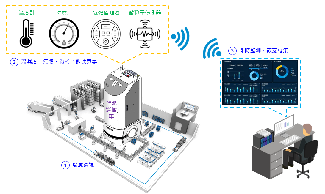 智能巡檢車會在被偵測場域上亂數移動,並在移動過程中,偵測該場域的溫濕度、氣體及微粒子數值,並同時將該數據資料上傳雲端,進行環境數據的蒐集。