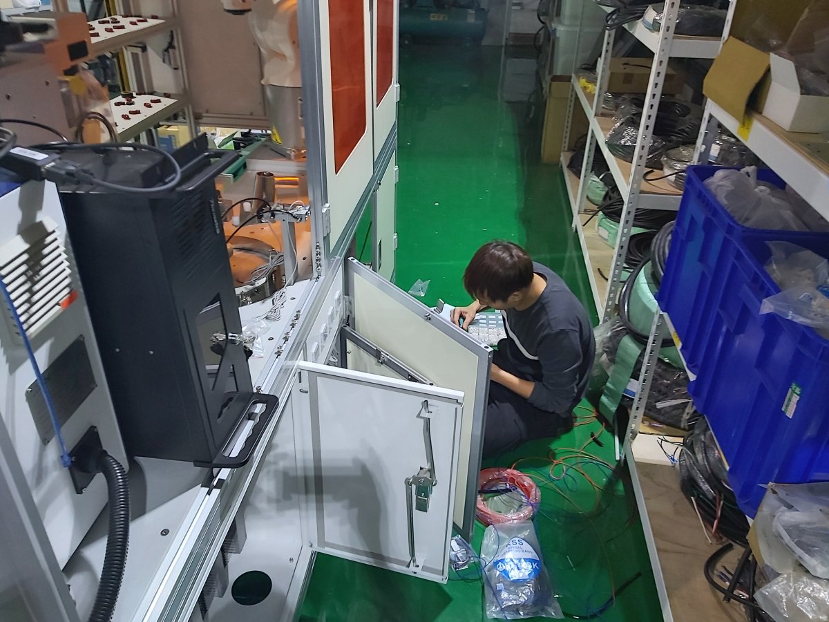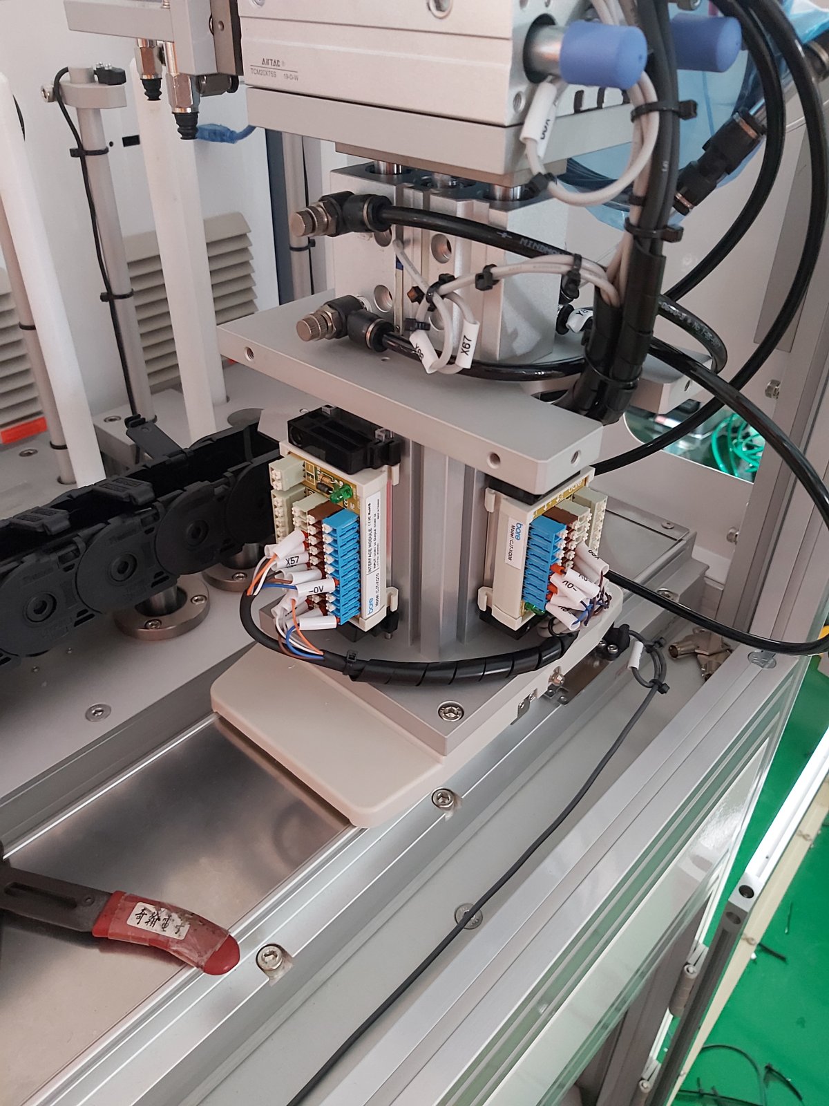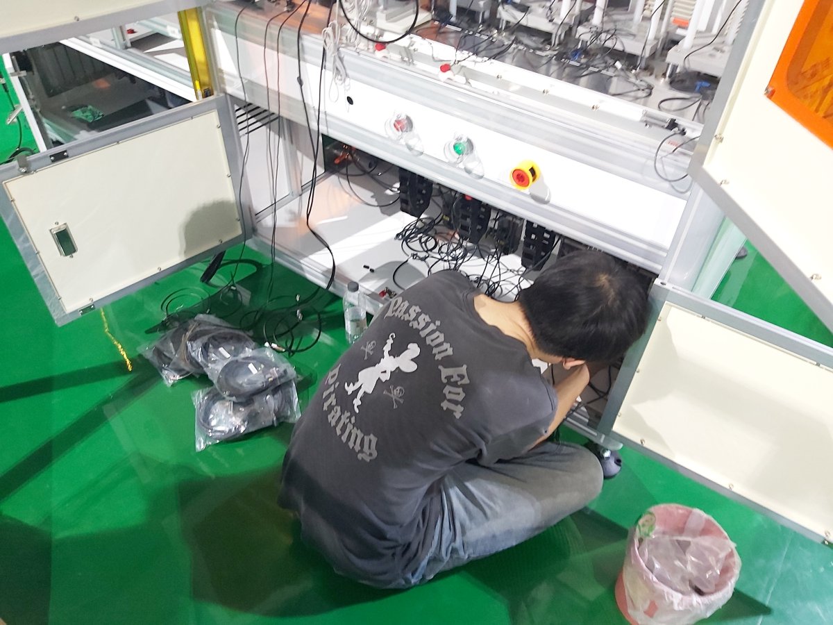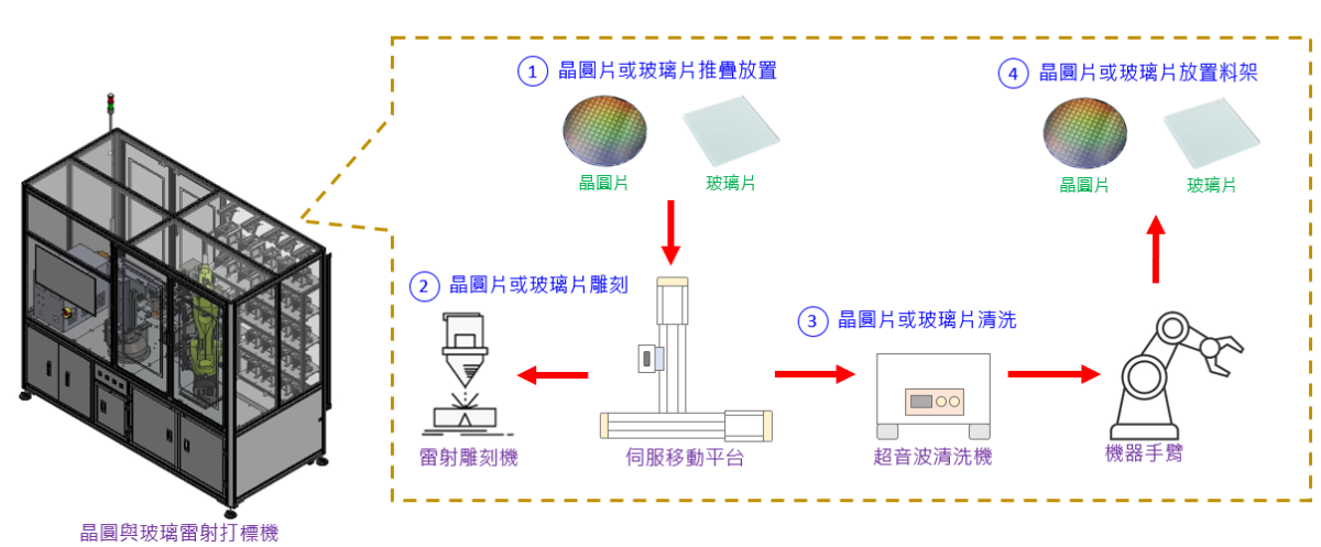 經由伺服移動平台將放置在待料區上的晶圓片與玻璃片,移載至雷射雕刻機上進行條碼刻印,並將刻印完後的晶圓片或玻璃片,再藉由伺服移動平台移動到超音波清洗機進行清洗,並利用離心力與吹氣將清洗後產生的水珠瀝乾,接續經由機器手臂將晶圓片或玻璃片放置在料架上,等待後續的製程作業。