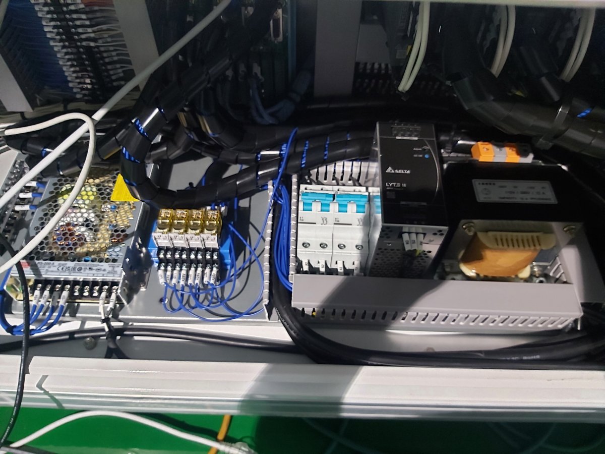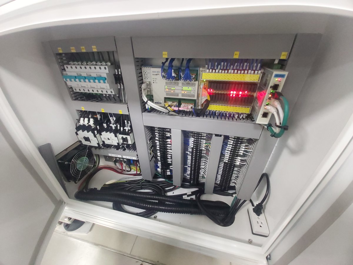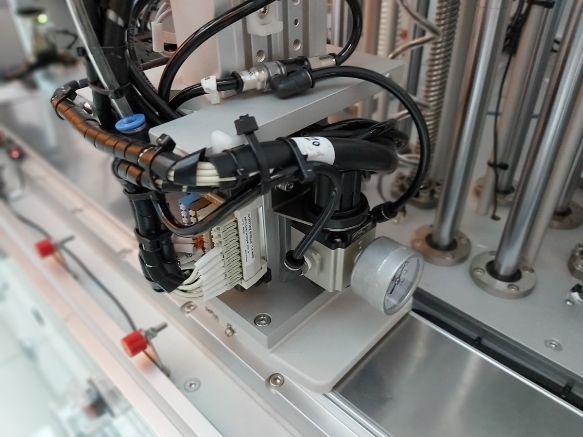經由伺服移動平台將放置在待料區上的晶圓片與玻璃片,移載至雷射雕刻機上進行條碼刻印,並將刻印完後的晶圓片或玻璃片,再藉由伺服移動平台移動到超音波清洗機進行清洗,並利用離心力與吹氣將清洗後產生的水珠瀝乾,接續經由機器手臂將晶圓片或玻璃片放置在料架上,等待後續的製程作業。