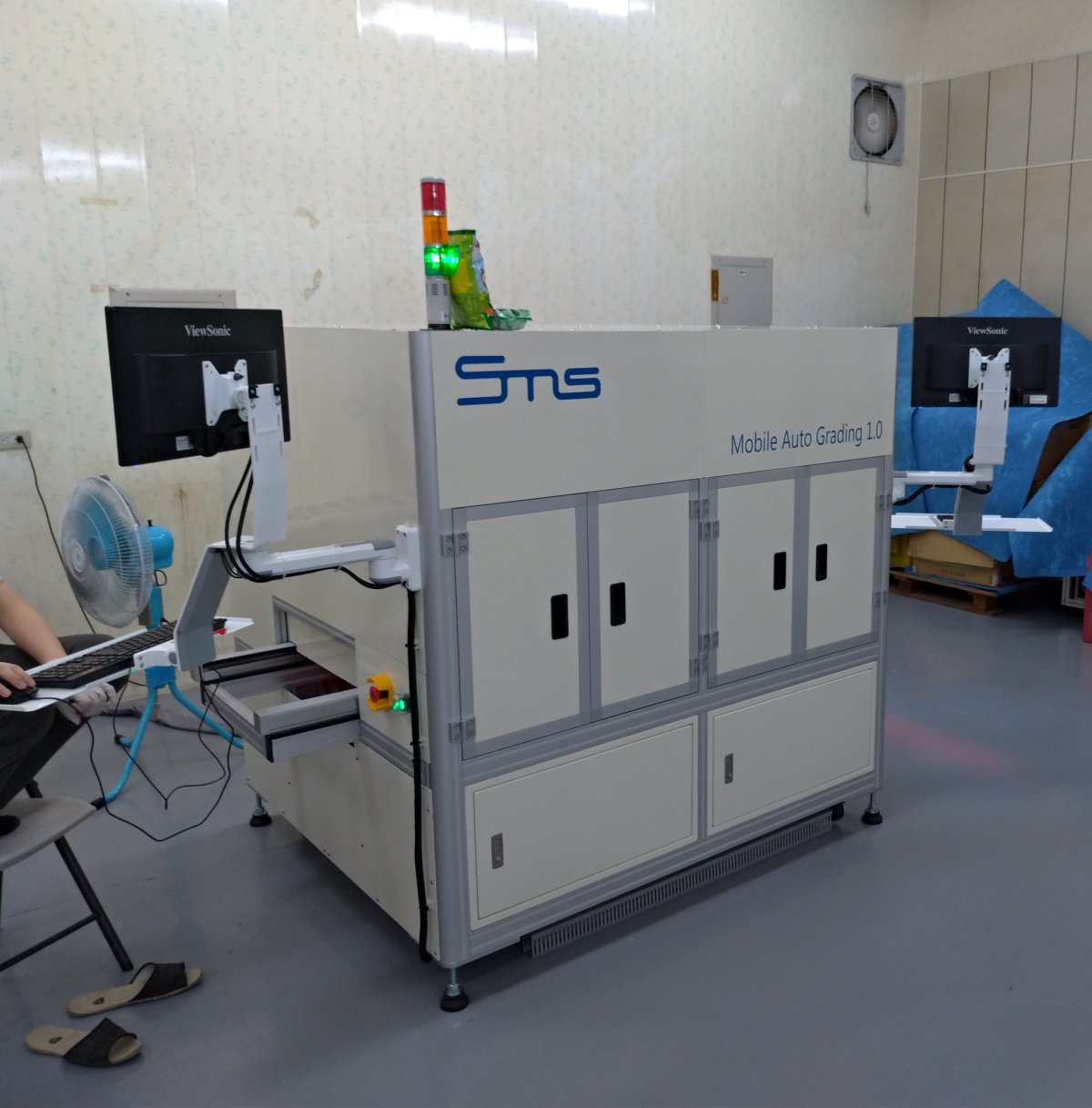 經由人工將需要檢測的手機放置於設備的入料站,設備會自動將手機運送至設備中,手機經由AOI的正面與背面的檢測,確認其手機外觀是否有碰撞、掉漆、刮傷、氧化、凹凸等問題,並將其檢測結果匯入系統中進行紀錄,再經由人工進行良品與不良品的分類工作。