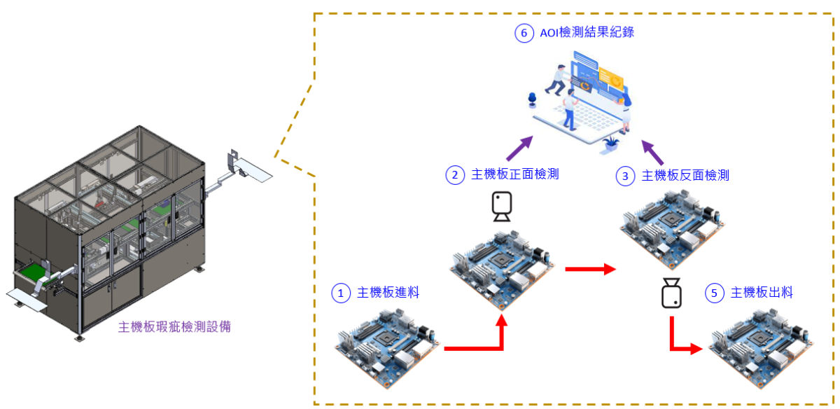 經由人工將需要檢測的主機板放置於設備的入料站,設備會自動將主機板運送至設備中,主機板經由AOI的正面與反面的檢測,確認其主機板外觀是否有缺PIN、斷PIN、PIN腳氧化、缺錫和斷錫等問題,並將其檢測結果匯入系統中進行紀錄,再經由人工進行良品與不良品的分類工作。