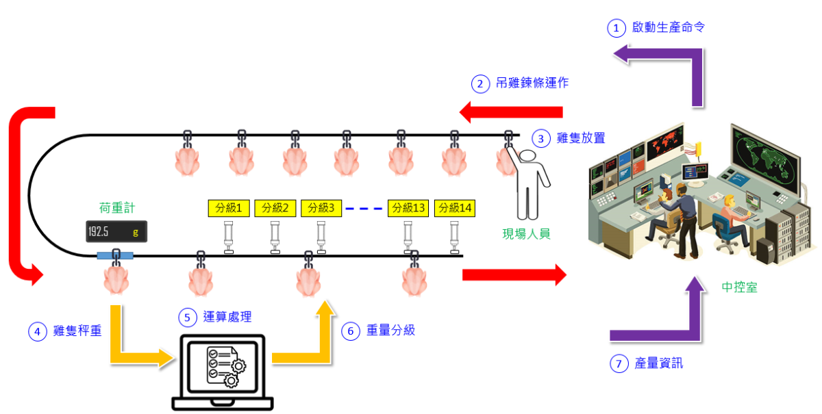 開始生產前,需在系統上進行各分級槽的重量設定,設定完成後,等待現場人員將需進行吊掛雞隻進行推疊整理,整理完成後,中控室下達鍊條運轉指令,鍊條開始循環運轉,現場人員將雞隻吊掛在鍊條的掛鉤上,雞隻隨著鍊條的轉動移動到荷重元進行重量檢測,並將該雞隻的重量資訊寫入系統中,當雞隻移動到對應的分級槽時,系統會啟動氣壓缸將雞隻打落完成重量分級的工作。並在雞隻分級的時候,同步將該雞隻的重量與分級槽的累積數量紀錄於系統中,現場人員就可以於中控室檢視每個時段的生產資訊。